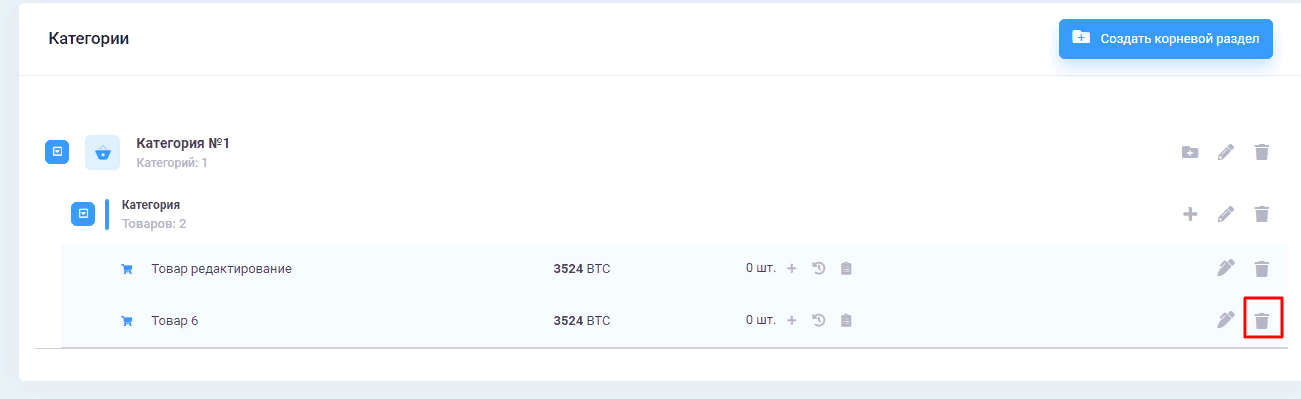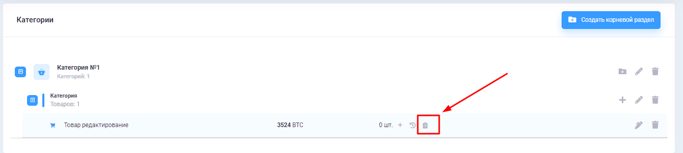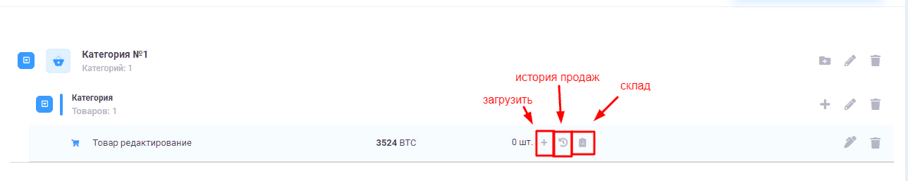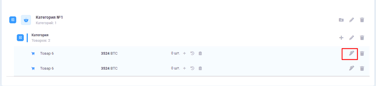 Для редактирования товара, необходимо нажать выделенную кнопку (перо).