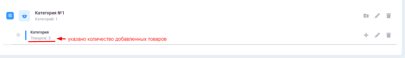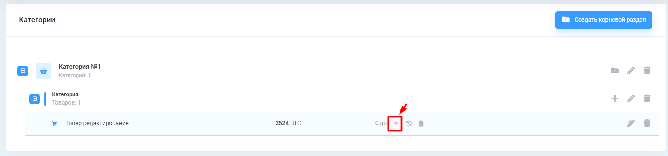 Чтобы добавить товар в категории, необходимо нажать выделенную кнопку (плюсик).