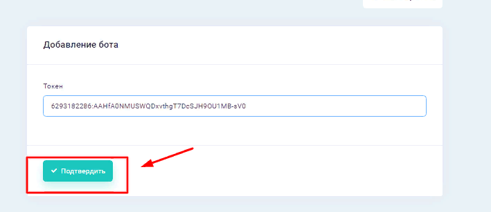 После того, как ввели ключ(токен) бота, нажимаем выделенную, синюю кнопку "<mark style="color:blue;">Подтвердить</mark>"